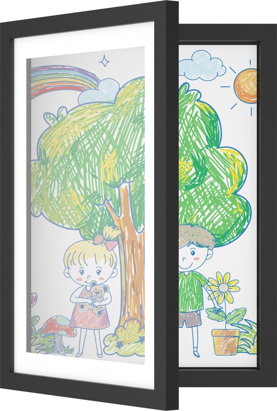 Krijg jij ook dagelijks genieten van de prachtige creaties van jouw kinderen? En blijft de ene kindertekening na de andere aan de muur, op de koelkast of stiekem in de prullenbak belanden? Dan is de houten kinderkunstwerklijst van Avalo precies wat je nodig hebt! Deze zwarte A4 display met afmetingen van 33x24x3.5 CM is ideaal om vele kindertekeningen op een mooie manier in te lijsten. Je hoeft geen oude tekeningen meer te verbergen, je plaatst simpelweg de nieuwste tekening bovenop de vorige. Zo blijf je genieten van elk kunstwerk moment na moment.