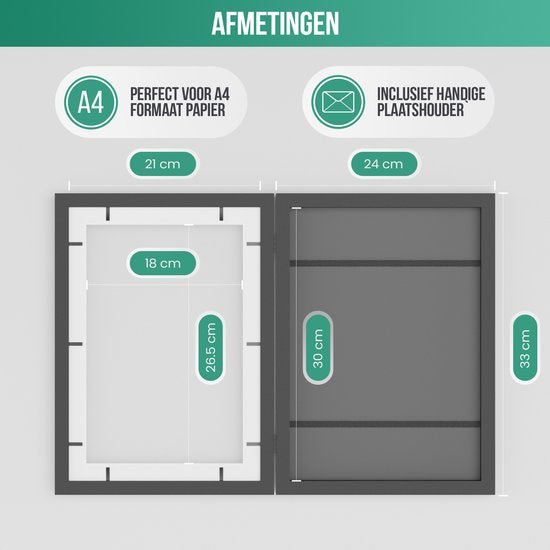 - Afmetingen binnenframe: 30 x 21 x 1,5 cm