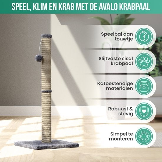Katten moeten hun nagels scherpen. Het is belangrijk dat de nagels niet te lang worden en scherp blijven; dit is goed voor de gezondheid van de klauwen en je kat. Daarom heb je een krabmeubel nodig. Zet je deze krabpaal van Avalo neer voor je kat? Dan brengt dit veel andere voordelen met zich mee. Een krabpaal draagt bij aan het behouden van een gezond gewicht, katten kunnen hun territorium afbakenen, jouw meubels worden minder snel aangetast én ongewenst kattengedrag kan verminderen of zelfs verdwijnen.