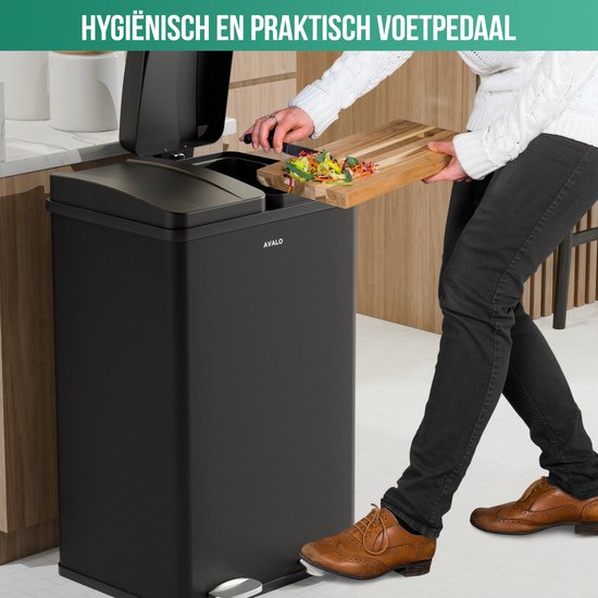 Avalo Prullenbak Afvalscheiding 60 Liter - RVS Zwart - 2 Vakken - Milieubewust, Hygienisch & Vingerafdrukvrij - Pedaalemmer / Vuilnisbak