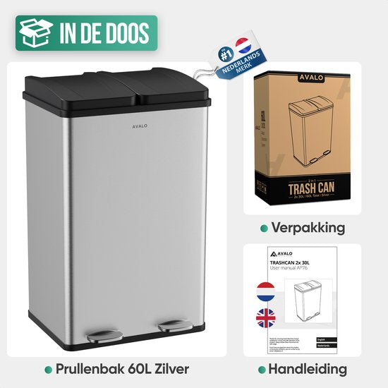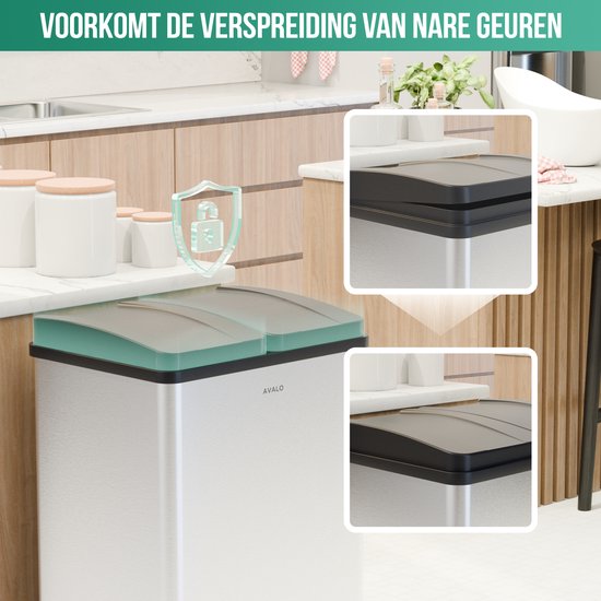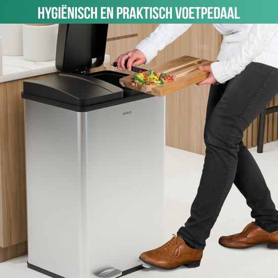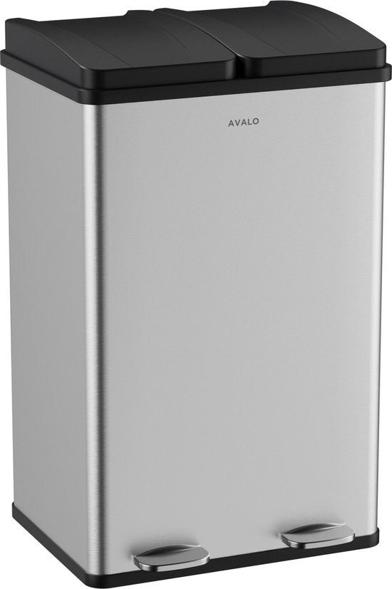 Avalo Prullenbak Afvalscheiding 60 Liter - RVS Zilver - 2 Vakken - Milieubewust, Hygienisch & Vingerafdrukvrij - Pedaalemmer / Vuilnisbak