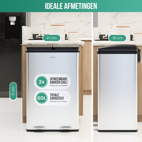 De elegante Avalo prullenbak heeft twee ruime afvalcompartimenten van elk 30 liter, waardoor afval scheiden eenvoudig wordt en je bijdraagt aan een milieuvriendelijkere wereld. Met een perfecte afmeting van 71x47x36 cm is deze prullenbak ideaal voor elke ruimte, of het nu in de keuken, garage of een andere plek in huis is.