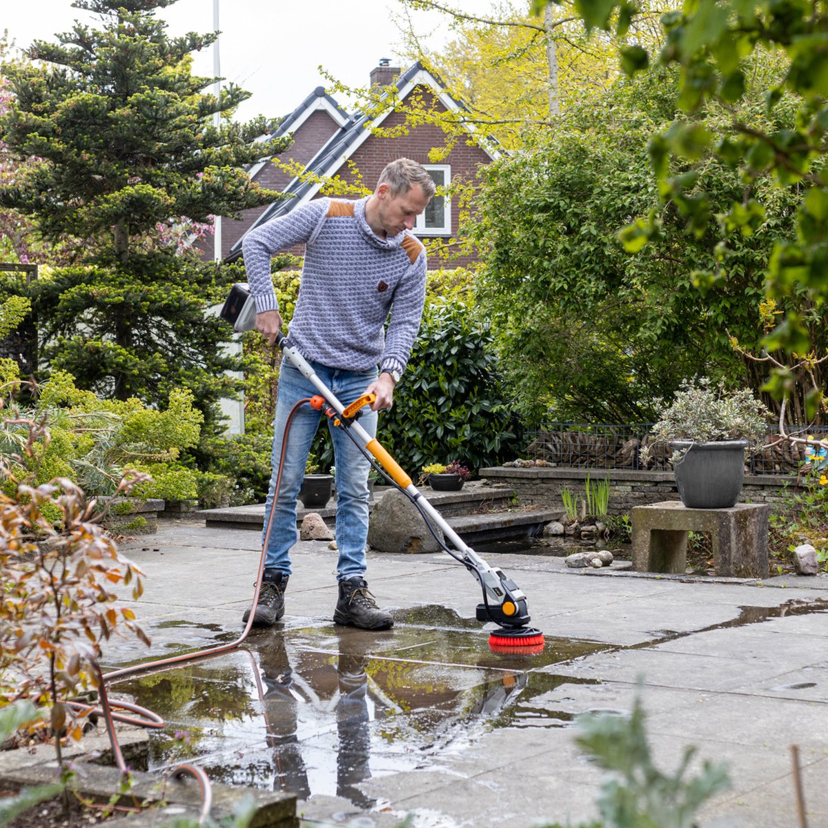 De Batavia Twin Brush 18V Brushless is een krachtige, snoerloze reinigingsborstel met gepatenteerd contraroterend borstelsysteem. Ideaal voor terrassen, boten, campers en meer. Dankzij de verstelbare borstelkop, waterdicht ontwerp (IPX7), en ingebouwde tuinslangaansluiting maak je elk oppervlak eenvoudig schoon – zelfs onder water.