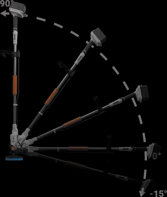 - Verstelbare borstelkop voor optimale controle - Eenvoudig te verstellen van -15° tot +90° om moeilijk bereikbare plekken en verticale oppervlakken te reinigen. reiniging met behoud van ergonomisch comfort.