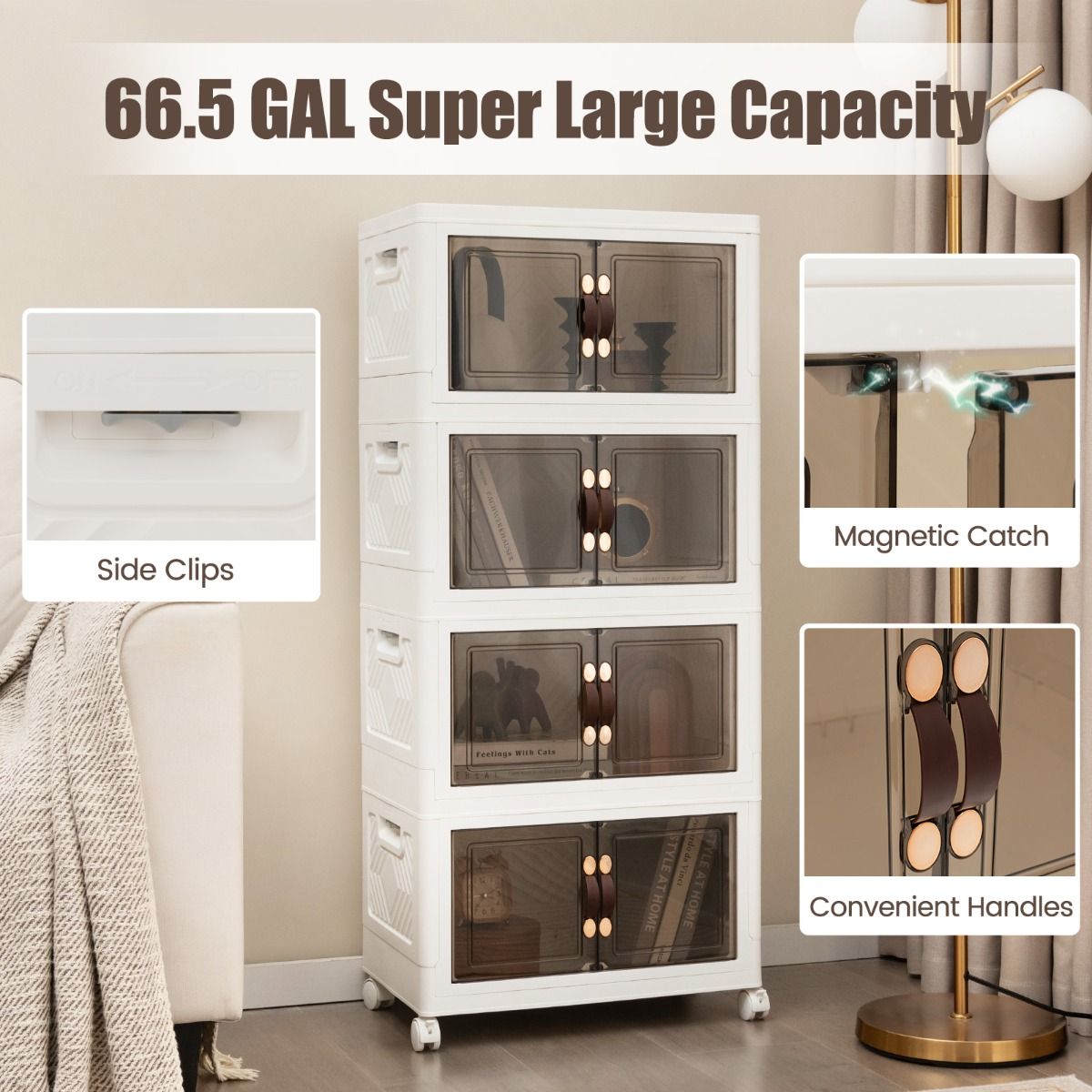 Elke stapelbare opbergbak heeft een grote capaciteit en biedt genoeg ruimte voor dagelijks gebruik. De deurtjes, handgrepen en magneten maken het makkelijk om bij de spullen te komen. Elke doos kan ook worden verwijderd en opgevouwen voor eenvoudig opbergen onder het bed of de bank. Ze zijn gemaakt van betrouwbaar PP-materiaal, zijn licht en duurzaam en hebben 4 vergrendelbare wielen voor mobiliteit. De kledingkast kan worden gebruikt als organizer voor kleding, speelgoed, schoenen en gereedschap. Hij is eenvoudig te installeren en voegt stijl toe aan je huis.