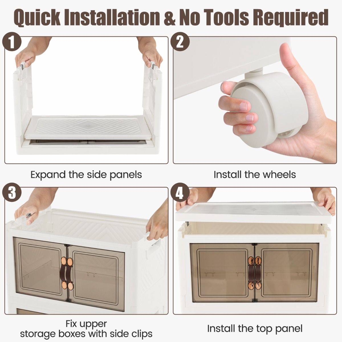 Eenvoudige installatie zonder gereedschap: Je kunt de kast eenvoudig installeren zonder gereedschap! Het enige wat je hoeft te doen is elk niveau van de organizer uit te vouwen, in elkaar te zetten en tot slot het deksel en de wieltjes te installeren. Een gedetailleerde handleiding is inbegrepen. Het lijdt geen twijfel dat deze moderne opbergbakken de inrichting van je huis stijlvoller zullen maken.