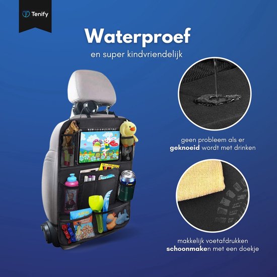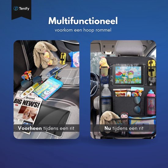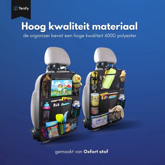 De organizer voorkomt een hoop rommel in de auto.en auto, maar biedt nog meer functionaliteit. Met deze Tenify organizer bescherm je de achterkant van de autostoel, terwijl de kinderen hun tablet of iPad (tot 10 inch) veilig kunnen gebruiken zonder kans op schade. Dit product wordt geleverd als een set van 2, zodat je meteen organizers voor beide stoelen hebt.