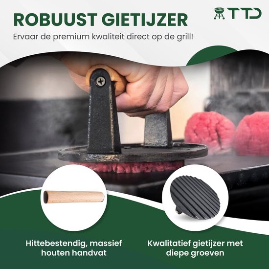 TTD® Hamburgerpers Gietijzer XL - Hamburgermaker Extra Zwaar - Hittebestendig - Strakke Grillgroeven - BBQ Accesoires - Barbecue Accessoires - Smash Burger - BBQ Gereedschap