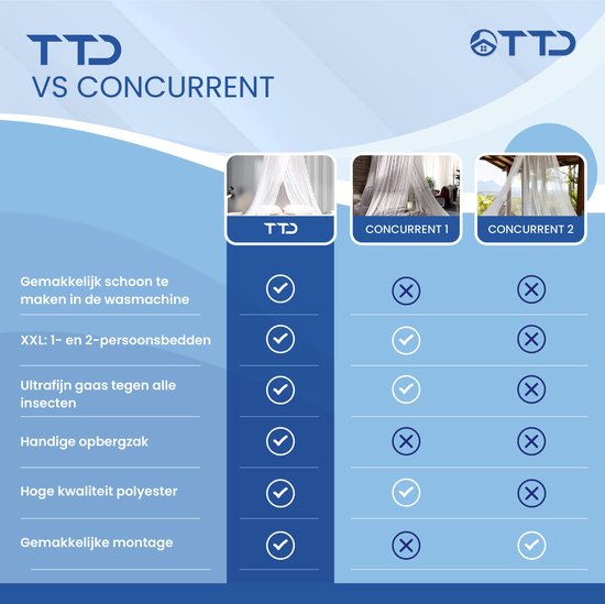 De TTD klamboe is speciaal gemaakt om je te beschermen tegen insecten en geeft tegelijkertijd een elegante uitstraling aan je slaapkamer. Of je nu een kingsize bed of een kleiner ontwerp hebt, de XXL TTD klamboe past vrijwel op elk bed en biedt uitstekende bescherming en confort.comfort. Geen hinderlijke muggen meer die je nachtrust verstoren, maar een ongestoorde nacht van ontspanning.