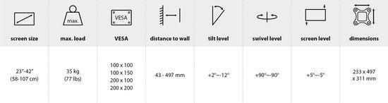 Productspecificaties:, Technische specificaties: - Montagetype: Muurbevestiging - Maximale capaciteit: 35 kg - Maximale capaciteit (pond): 77 lb - Afstand tot de muur: 43-497 mm - Schermniveau: -5-5 ° - Schermgrootte: 58-107 cm - Schermgrootte (inch): 23-42 in - Zwenkniveau: -90-90 ° - Kantelniveau: -12-2 ° - VESA-montage: 100 x 100, 100 x 150, 200 x 100, 200 x 200 , Toepassingseigenschappen: - Beschikbare talen van de gebruiksaanwijzing: Nederlands, Engels, Frans, Duits, Italiaans, Portugees, Spaans - Beheer van kabels: Ja , Basis productinformatie: - Kleur van het item: Zwart - Diepte van het item: 233 mm - Hoogte van het item: 497 mm - Breedte van het item: 311 mm - Gewicht van het product: 2550 g - Materiaal: Staal