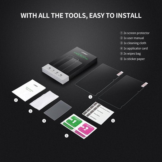 •Verpakkingsinhoud: 2x Screenprotector, 3x Stofabsorbeerder, 2x Nat doekje, 1x Reinigingsdoekje
