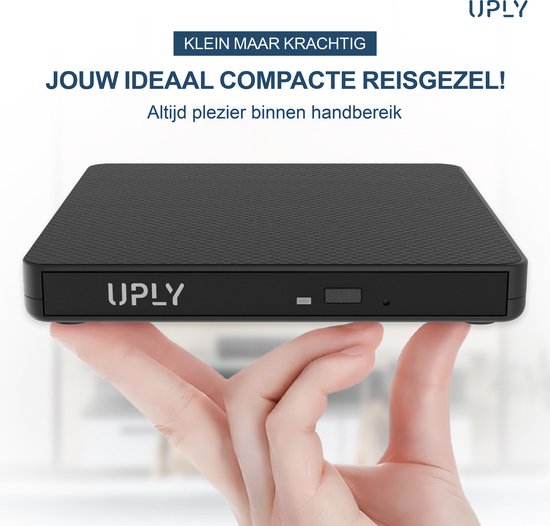 De UPLY externe DVD-speler heeft geen externe stroombron nodig. Sluit hem simpelweg aan op je USB-poort en je kunt direct aan de slag. Geen gedoe met extra kabels of het zoeken naar een stopcontact, wat erg praktisch is.ls ook als je onderweg bent.