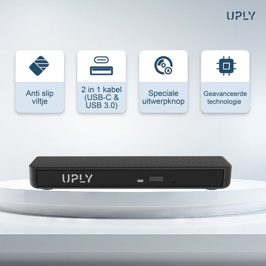Klaar om jouw CD's en DVD's te lezen of te branden wanneer en waar je maar wilt? Ontdek dan de UPLY externe DVD-speler, perfect voor iedere laptop, desktop, MacBook of notebook. Sluit hem moeiteloos aan wanneer het jou uitkomt. Dankzij de USB 3.0 en USB-C aansluitingen is hij veelzijdig en eenvoudig in gebruik.