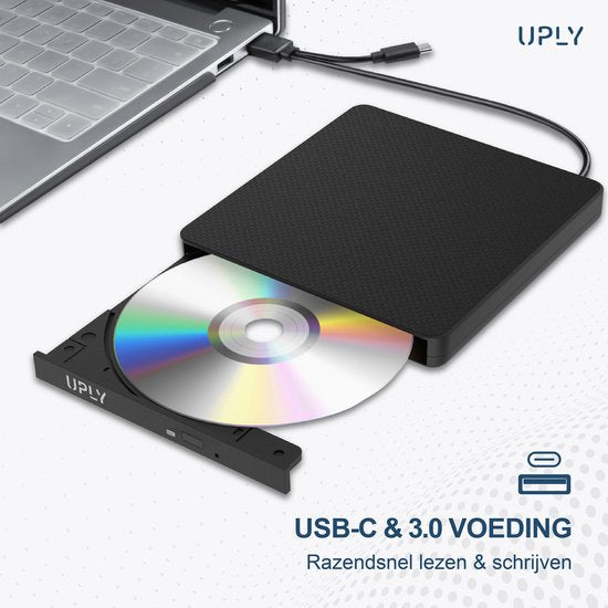 UPLY Externe DVD Speler - Windows en Mac - USB C en USB 3.0 - Externe DVD Speler voor Laptop - Externe DVD Speler en Brander - CD