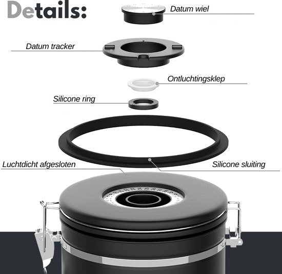 Dankzij het CO2-uitlaatventiel kunnen koffiebonen ontgasd worden zonder dat er lucht in de container komt. Dit stelt je in staat om de geur van de koffie waar te nemen zonder dat de versheid van de bonen in gevaar komt. Daarnaast is de koffiebus uitgerust met een instelbare datumregistrator waarmee je de houdbaarheidsdatum van je voedingsmiddelen kunt bijhouden.