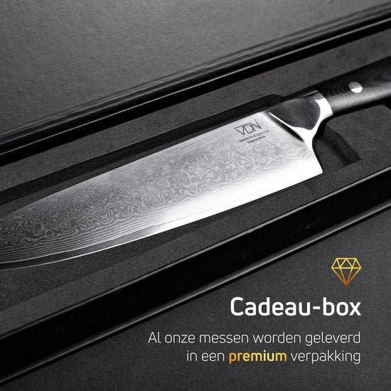 De VDN Elegance-collectie biedt een uitgebreid assortiment aan keukenmessen. Het blad van deze messen is vervaardigd met een kern van hoogwaardig VG-10-staal, dat een hardheid heeft van 60-62 HRC. Met zorg gesmeed door ervaren ambachtslieden en nauwkeurig afgewerkt. Rondom de snijkern zijn 66 lagen prachtig Japans damaststaal aangebracht. Dit is verder afgewerkt met een handvat van G-10 uit Spanje. Deze unieke combinatie maakt de keukenmessen niet alleen uiterst praktisch, maar ook showstopper in je keuken.