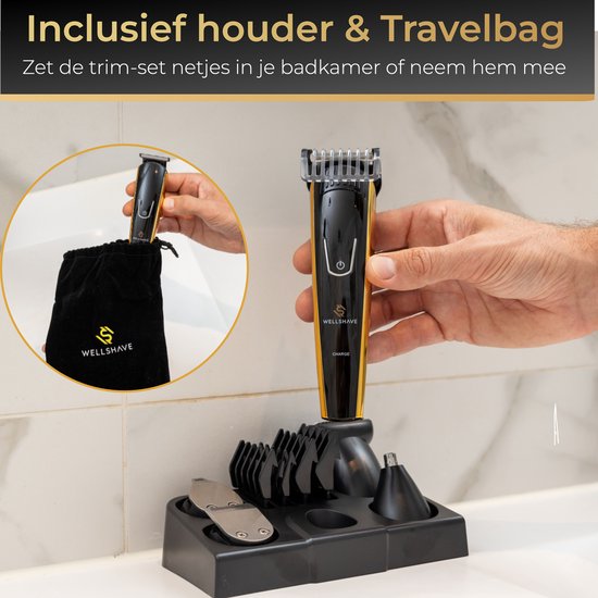 De Wellshave baardtrimmer en bodygroomer worden geleverd met 5 opzetstukken voor optimale verzorging. Tevens bevat het een praktische travelbag en een opzetstuk met een draaiknop voor lengtes van 1mm tot 9mm! De hele trimmer is spatwaterdicht, maar NIET volledig waterdicht. Dompel dit apparaat dus niet onder in water of gebruik het op plekken waar het te veel in aanraking komt met water. Alle opzetstukken zijn eenvoudig afwasbaar. We bieden ook een trimmerstandaard aan waarin je alle opzetstukken, de lader en de trimmer kunt opbergen. De trimmer is uitgerust met een Li-ion batterij. Laad de trimmer 2 uur op voor 1,5 uur gebruiksplezier!