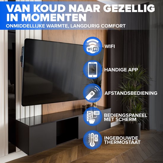 Slimme Bediening via WiFi: Bedien de verwarming eenvoudig met je smartphone. Stel de temperatuur in, zet de verwarming aan of uit en gebruik de 24-uurs timer, zodat je nooit meer de verwarming handmatig hoeft te regelen.