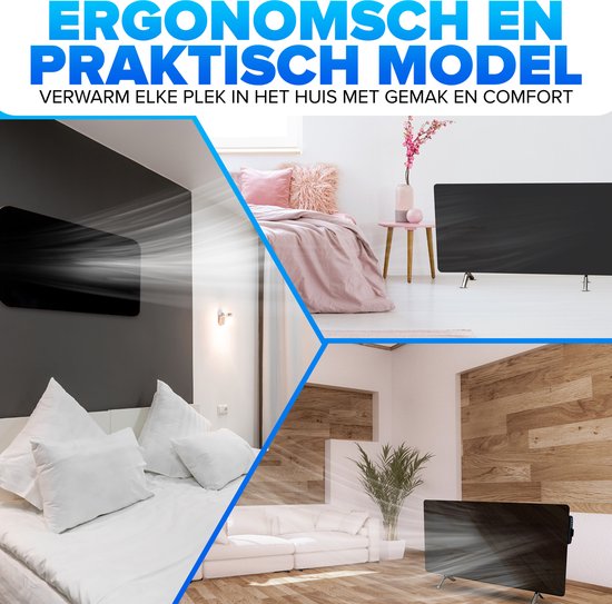 Makkelijk te Installeren: Monteer de verwarming eenvoudig aan de muur of zet deze neer als vrijstaand model voor flexibele installatie.
