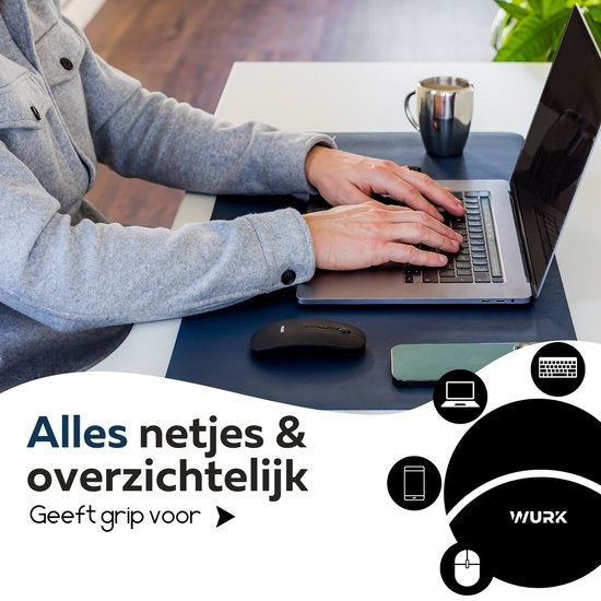 De professionele bureau onderlegger van Wurk geeft uw bureau een geweldige uitstraling! De bureau organizer zorgt ervoor dat je gehele bureau voorzien is van een prachtige egale ondergrond. Hierdoor is het ideaal om met uw laptop of toetsenbord erop te werken. De bureau onderlegger is ook nog eens een computer muismat waarbij laptops en toetsenborden stevig op de mat blijven staan. Nu inclusief USB-kabel clip. Waarmee u enkele kabels gemakkelijk op uw bureau kunt vastclippen.