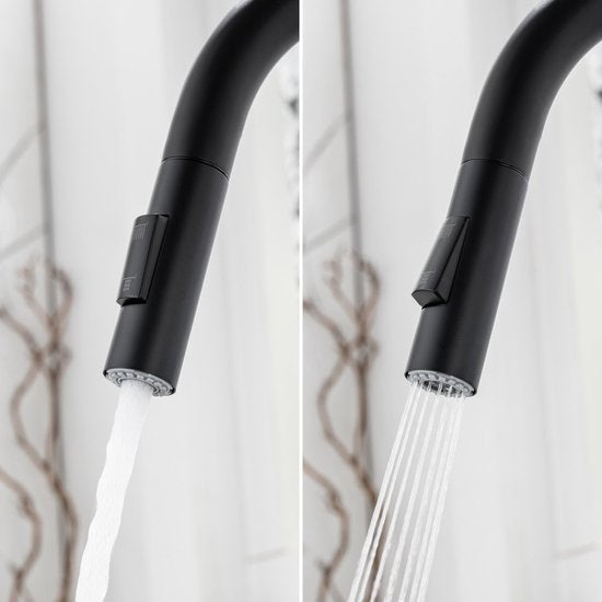 Met een elegant ontwerp, 2 slimme functies en een uittrekbare spuitkop is deze matte zwarte kraan